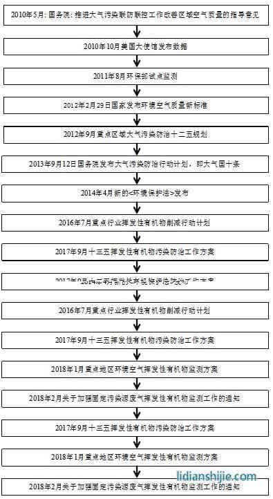 為了促進經濟的可持續性發展,推進大氣環境的治理和保護、推動節能減排目標的進展,國家層面上頒布了一系列法規、政策對VOCs治理行業進行支持和引導,促進VOCs行業的規范和健康發展。主要的法規、政策、監測類規范標準及大事記見圖1: