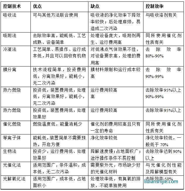 不同的治理技術都有其特定的適用范圍和使用條件,只有在其特定的適用范圍和使用條件下才能夠達到理想的治理效果,在經濟上也是合理的。表1比較了各種技術的優缺點及其控制效率。