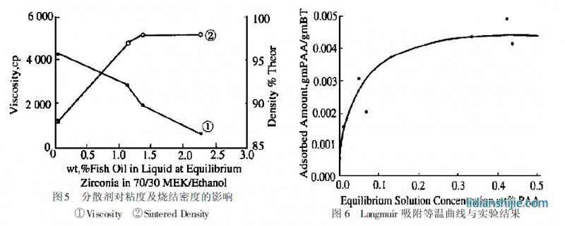 2 .1 .1 分散劑的最佳用量 經過實驗證明, 無論是用于研磨, 還是用于陶瓷漿料的穩定分散, 都存在一個最佳用量的問題.隨著分散劑的加入, 陶瓷漿料的粘度逐漸降低, 陶瓷燒結后密度更接近于理論密度(見圖5).但分散劑的用量有一定限度, 超過一定量后, 粘度不會減小, 反而可能增加.其主要原因是分散劑過量時, 粉體吸附的分散劑達到單層飽和狀態, 使進入液相的自由分散劑分子濃度增大, 對粉體產生橋聯作用, 從而使粉體間的作用加強, 漿料粘度加大.所以從理論上來說, 最佳的用量取決于