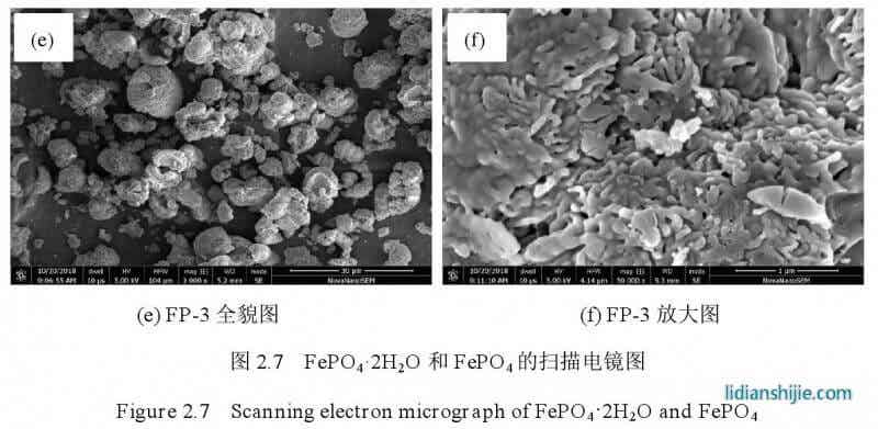 圖 2.7 是 Fe PO4·2H2O 和無(wú)水 Fe PO4的掃描電鏡圖,與氨水沉淀制備的十分相似,只是在具體細(xì)節(jié)上有所區(qū)別。控制結(jié)晶法制得的 Fe PO4·2H2O 呈類球形;經(jīng)過(guò)陳化晶化處理,F(xiàn)e PO4·2H2O 顆粒明顯增大,變成球殼狀,具有微納米結(jié)構(gòu);600 ℃焙燒處理制得的無(wú)水 Fe PO4基本保持了燒前 Fe PO4·2H2O 的形貌,仍為球殼狀。