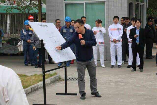張良均總監(jiān)向中山市消防局一行詳細(xì)介紹公司消防平面圖及講解鋰離子電池生產(chǎn)工藝流程。
