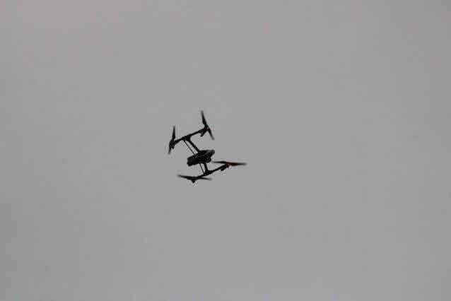 運用無人機探測發(fā)生事故區(qū)域,趕到現(xiàn)場的消防員們先迅速拉好警戒線,然后用水管不斷向模擬發(fā)生事故的區(qū)域沖水。
