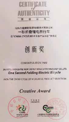 鋰電世界 日前,由中國自行車協會、中國國際自行車展覽會組委會主辦的“CHINA CYCLE2014創新產品評選活動”經專家評委歷經一個半月的評選,最終結果已出爐,猛獅科技旗下猛獅新能源車輛技術有限公司最新推出的一秒折疊鋰電自行車榮獲“CHINA CYCLE2014創新獎”。