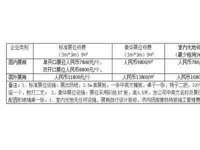 B、收費標準:標準展位(3m×3m)9m2,國內企業:人民幣4800元/個,(展位配置:三面展板、中文楣板一塊、一張洽談桌、兩把洽談椅、220V/200W電源插座1個、射燈2只;角位上浮20%)。36m2起租,空地不含任何設施,展商自行設計搭建特裝,空地搭建需交展場管理費每平米20元,押金5000元,一切費用由參展商自付。特裝搭建公司在2014年3月1日前向組委會申報。