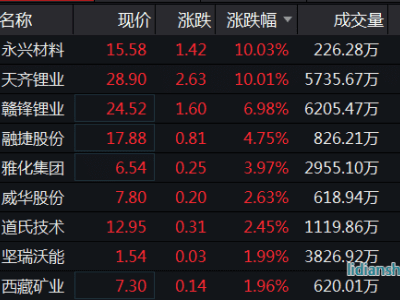 8月1日早盤,鋰電池概念持續拉升,截至發稿,藍海華騰、道氏技術、賢豐控股漲停,天齊鋰業漲近9%,杭可科技漲超8%,江特電機漲超7%,其余個股紛紛跟漲。