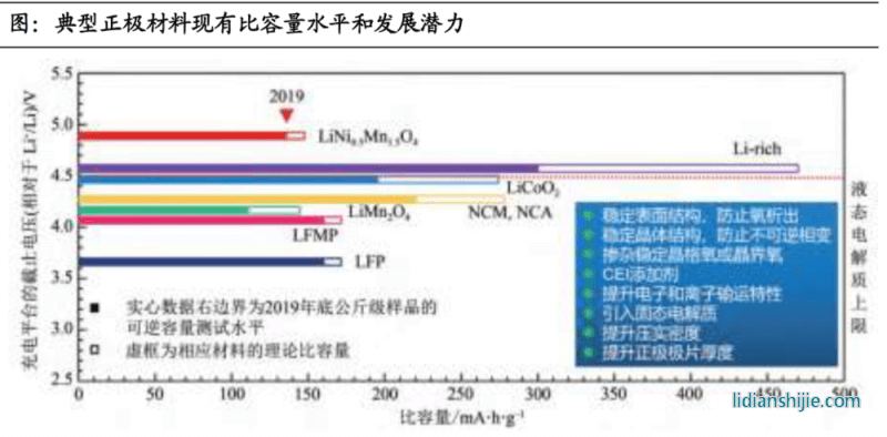正極材料中,磷酸鐵鋰現有容量可達到 160-165mA.h/g,接近理論極限 170160-165mA.h/g,高壓錳酸鋰正極比容量理論上可進一步提高,鈷酸鋰、鎳鈷錳酸鋰、鎳鈷鋁酸鋰和富鋰錳基正極材料比容量提升空間較大。除此之外,材料穩定性、界面穩定性和高壓下傳統電解液改性或者向固態電解液過渡等是正極材料未來的發展趨勢。