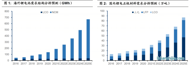 由此必然引發行業長期向好。根據測算, 2025 年全球鋰電正極材料需求從 2020 年的 47萬噸增至 190 萬噸,CAGR 達到 32%。國內鋰電正極材料需求量有望從 2020年的 23.8 萬噸增至 2025 年的 86.8 萬噸,CAGR 近 30%,預計 2025 年三元需求 46.8 萬噸,LFP 需求 34.7 萬噸,LCO 需求 5.3 萬噸;海外 2025 年正極材料需求預計為 103 萬噸。