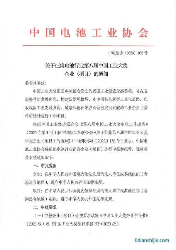 根據中國工業經濟聯合會《第八屆中國工業大獎申報工作通告》(2023年第1號)和中國輕工業聯合會《關于征集第八屆中國工業大獎申報企業(項目)的通知》(中輕聯標準〔2023〕136號)要求,中國電池工業協會將組織電池行業優秀企業(項目)進行申報和推薦,現將有關事項通知如下: