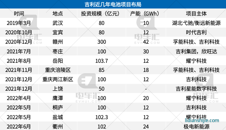 吉利近幾年電池業務布局(據公開報道統計)