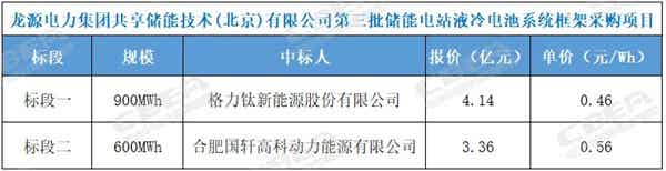 該項目分為兩個標(biāo)段,標(biāo)段一預(yù)估量為900MWh,格力鈦新能源中標(biāo),投標(biāo)報價4.14億元,折合單價0.46元/Wh;標(biāo)段二預(yù)估量為600MWh,國軒高科中標(biāo),投標(biāo)報價3.36億元,折合單價0.56元/Wh。這也是整個5月系統(tǒng)中單價最低的項目。