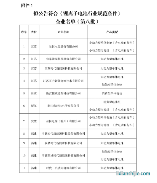 1. 擬公告符合《鋰離子電池行業(yè)規(guī)范條件》企業(yè)名單(第八批)