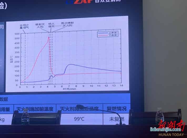 最后再用目前通用的、傳統的滅火產品進行對比試驗,一組三里鋰電池被點燃,等到火勢最大、燃點最高值的時候,再噴上傳統的滅火產品,噴上滅火劑的瞬間火勢壓制了一下,但是幾秒鐘后又”死灰復燃“,并這樣反反復復好幾次,始終不能把火勢徹底控制。然后,再用上這款多相類鋰電池專用滅火產品,才徹底把火滅掉,兩種產品的滅火效果形成鮮明的對比。