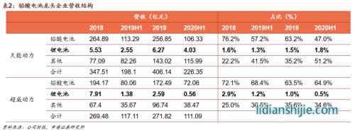 天能動力2020H1鉛酸電池營收106.3億元,占當(dāng)期總營收比例47%,鋰電池營收4.03億元,占比僅1.8%;