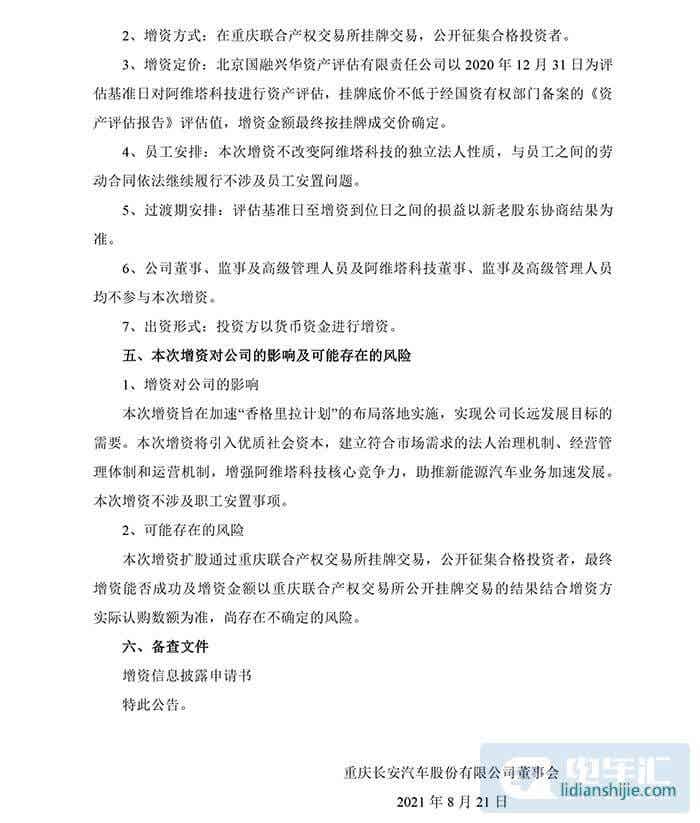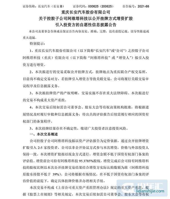 電車匯消息:8月21日,長安汽車公告,旗下阿維塔科技(重慶)有限公司通過公開掛牌增資擴股引入2-5家投資者。
