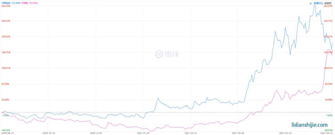 圖6:貝特瑞和母公司中國寶安集團的股價走勢圖,資料來源:雪球