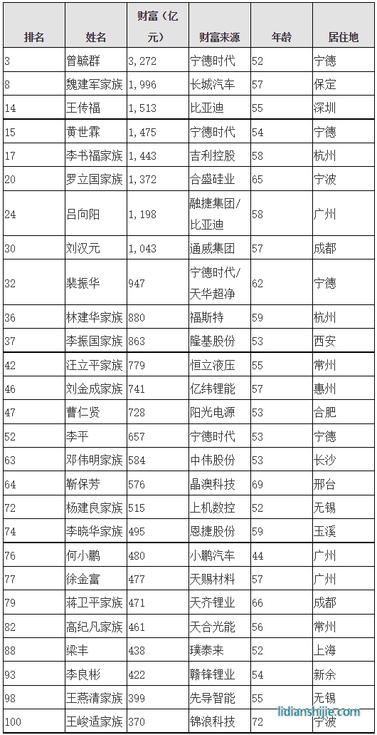 目前中國式全球最大的汽車市場和電動汽車市場,同時也是全球最大的鋰電池供應國。寧德時代已經連續多年雄霸全球動力電池出貨量第一的企業。除了曾毓群之外,同樣參與電動汽車和鋰電池的中國百強富豪還有寧德時代的黃世霖、比亞迪的王傳福、吉利控股的李書福家族、天齊鋰業的蔣衛平家族、小鵬汽車的何小鵬、贛鋒鋰業的李良彬等。
