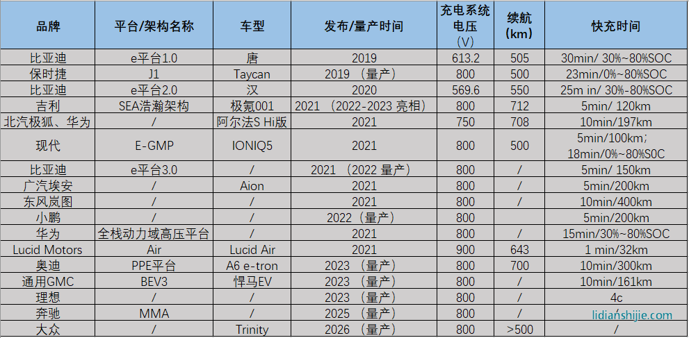 這里要說明一點,2021年,國內車企早就掀起了一輪800V平臺車型的發布熱潮。比亞迪、吉利、極狐、現代、廣汽、小鵬等都陸續發布了搭載800V平臺的車型,其中極氪汽車、小鵬、比亞迪等都將800V平臺車型的量產定在了2022年。2022年,可以說是“800V元年”。
