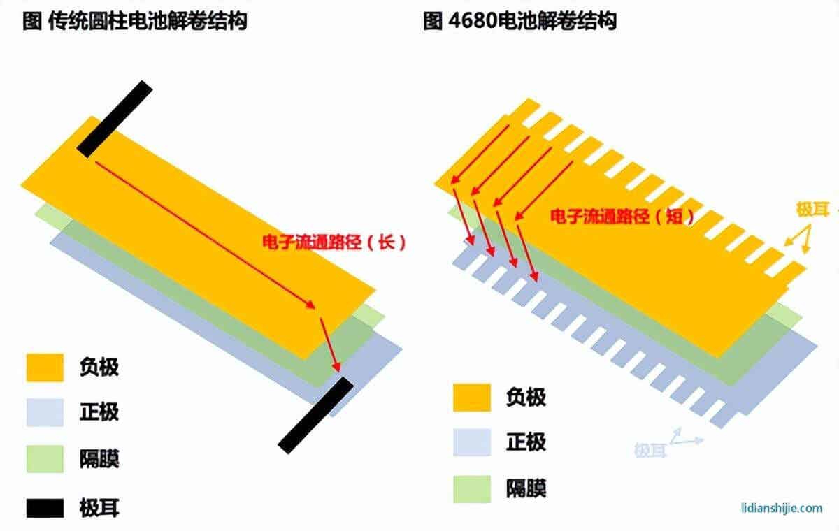 除了尺寸之外,4680電池還有一些技術(shù)創(chuàng)新。比如它采用了無極耳或全極耳的設(shè)計(jì),就是把正負(fù)極薄膜上的邊緣都做成鋸齒狀,然后折成一個(gè)平面作為輸出端。這樣可以大幅減少動(dòng)力電池的發(fā)熱和內(nèi)阻,提高效率和安全性。