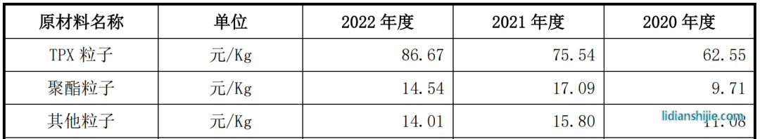 新廣益生產所需的原材料主要為粒子、基材以及其它輔助材料等,2022年粒子的采購金額占到采購總額的53.99%,較2020年上漲了14個百分點。其中TPX粒子采購金額增長明顯,一方面是因為新廣益加大了囤貨,另一方面TPX粒子的采購單價明顯上漲,從2020年的62.55元/Kg增長至2022年的86.67元/Kg。