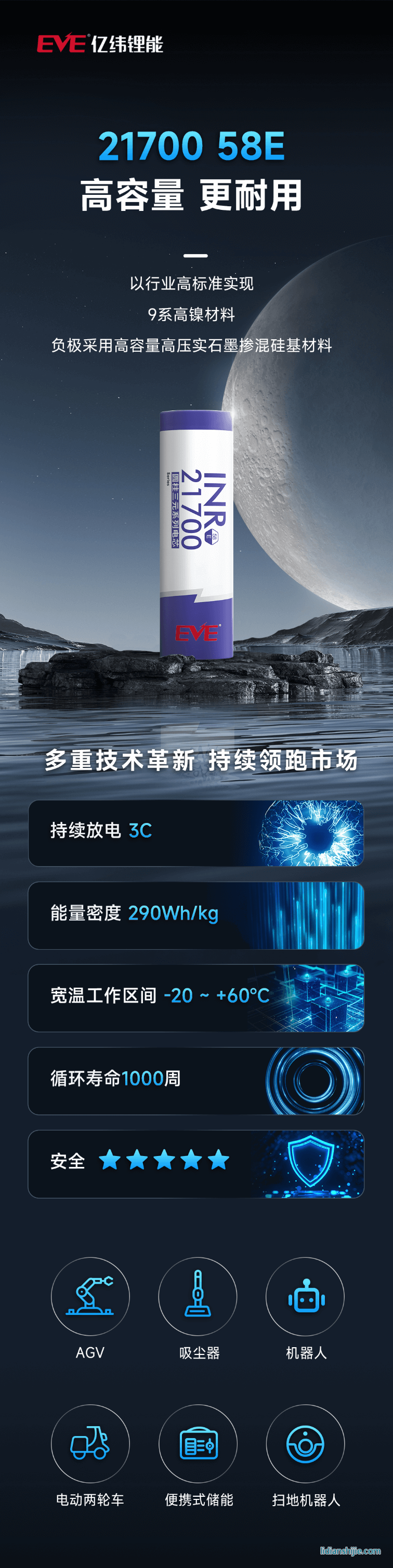 領先發布的21700 58E高容量產品,采用9系高鎳材料、負極采用高容量高壓實石墨摻混硅基材料,能量密度高達290Wh/kg,滿足產品長續航要求,匹配電動兩輪車、AGV、便攜式儲能、掃地機器人等多元應用場景。