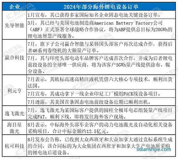 今年以來,包括先導智能、贏合科技、利元亨、逸飛激光、海目星激光、杭可科技等在內的國內鋰電設備領域頭部企業,陸續斬獲海外鋰電設備大單,或已實現大批量向海外供貨。