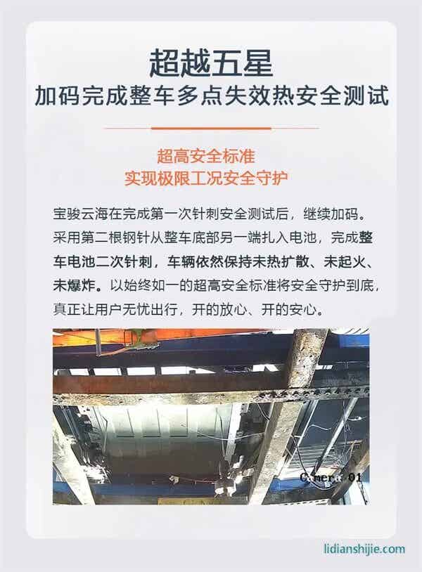 據(jù)介紹,該認(rèn)證是國(guó)內(nèi)非常嚴(yán)格且具有權(quán)威性的測(cè)試,它主要考察的是電池?zé)崾Э厍闆r下整車(chē)的安全表現(xiàn),測(cè)試過(guò)程檢驗(yàn)了從應(yīng)急救援到火災(zāi)防護(hù)等多個(gè)維度。另外,寶駿云海還在五星認(rèn)證基礎(chǔ)上又進(jìn)行了整車(chē)多點(diǎn)失效熱安全測(cè)試,在行業(yè)首次模擬整車(chē)電池二次針刺測(cè)試,測(cè)試中,測(cè)試組織方模擬了整車(chē)事故中電池包面臨二次受損的狀況,將第二根鋼針從寶駿云海的底部另一端扎入電池,寶駿云海全程無(wú)熱擴(kuò)散、無(wú)起火、無(wú)爆炸現(xiàn)象, 以始終如一的超高安全標(biāo)準(zhǔn)順利通過(guò)加碼測(cè)試,實(shí)現(xiàn)極限工況安全守護(hù)。