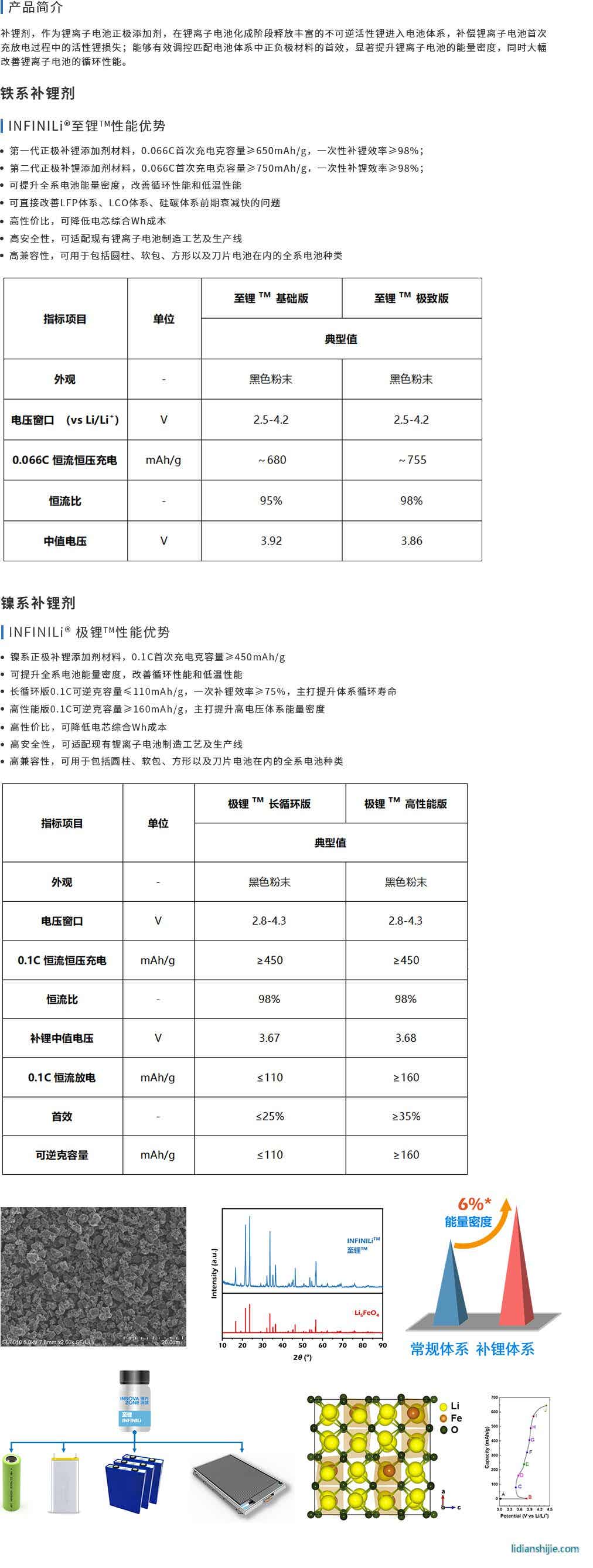 補悝劑, 作為理離子電池正極添加劑, 在理離子電池化成階段釋放豐富的不可逆活性理進入電池體系, 補償理離子電池首次充放電過程中的活性理損失;能夠有效調控匹配電池體系中正負極材料的首效, 顯著提升悝離子電池的能呈密度, 同時大幅改善捚離子電池的循環性能。