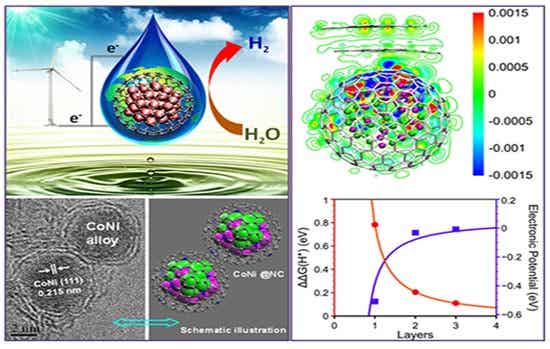 理論模擬和實驗研究表明,在催化反應過程中,活性金屬納米粒子催化劑在納米碳空腔中的封裝阻斷了其與苛刻反應環境(如酸性、堿性和強氧化性等)的直接接觸,有效地延緩和阻止了催化劑的失活,同時,被包裹的納米金屬的活性價電子通過與類石墨烯碳層的相互作用“穿透(penetration)”到外表面,實現了高效催化反應。基于這一原理制備得到的石墨烯碳層封裝的納米鈷-鎳催化劑應用于強酸性條件下電解水制氫反應(HER),表現出了優異的催化活性和穩定性,在電流密度為10 mA/cm2 的條件下,電解水陰極過電位僅為142 mV,性能接近于通常采用的40%Pt/C催化劑,相關結果于近日在《德國應用化學》(Angew. Chem. Int. Ed., 2015, DOI: 10.1002/anie.201409524)在線發表,并被該期刊選為“熱點文章(Hot Paper)”。