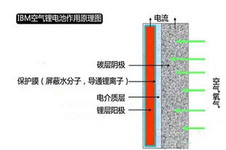 IBM空氣鋰電池的結構如圖所示,陽極為鋰金屬板,陰極為表面碳層,中間有兩層電解質,其中靠近鋰金屬電板一側的電解質負責接收由鋰金屬板釋放的鋰離子,而靠近碳層一側的電解質則負責把接收到的鋰離子更好地滲透至碳層。兩種電解質中間有阻擋膜,用以阻止不同層面物質之間的相互滲透與污染。