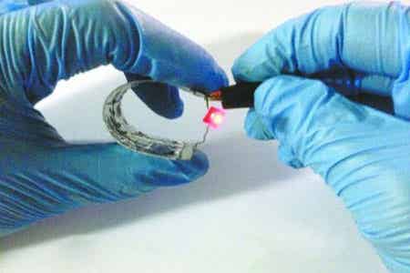 一個偌大的手機揣在兜里,鼓鼓的,在夏天總是感覺有些不方便,如果哪天手機可彎可卷,能像啪啪圈一樣戴在手臂上應當是件很酷的事情吧。這樣的手機需要什么樣的電池呢?應該是可彎可卷的柔性全固態薄膜鋰電池?,F在實驗室已經研制出了這樣的鋰電池。國外有報道稱已經在80μm厚的柔性Al箔上沉積Al/Li8V2O5/LiPON/V2O5/Au,制備出了柔性薄膜鋰電池,該電池在10μA/cm2電流密度下循環次數超過5800次,容量衰減小于7%。自2003年起,國內一些高校和科研院所陸續開展了柔性薄膜鋰電池的研究,但這些研究主要集中在關鍵材料制備上,缺乏電池整體制備技術,仍處于基礎研究的初級階段,同時受資金和技術制約,柔性全固態薄膜鋰電池至今沒有產業化的報道。中航工業航材院也組建了相應的團隊,現已在超薄聚酰亞胺(PI)上實現了以LiPON為電解質的單芯柔性薄膜鋰電池和串并聯電池模塊也在金屬箔基片上實現了更適用于商業化的薄膜鋰電池,實驗數據目前在持續測試中,圖為中航工業航材院制備的柔性薄膜鋰電池的原理型樣件。