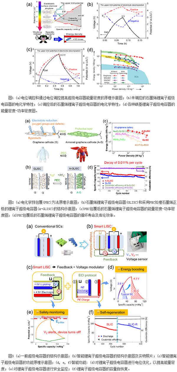 將調(diào)控后的正、負(fù)電極組裝成超級電容器,如圖1b, c所示,正負(fù)極在充電過程中同時到達(dá)電解液可用電位的上下限,極大地提高了超級電容器的工作電壓和比容量。由于超級電容器所儲存的能量與工作電壓和活性材料的容量成正比,因此其能量密度大大增加,如圖1d所示。該方法具有普適性,目前已經(jīng)在多種碳基超級電容器上驗(yàn)證有效。特別是以石墨烯作為活性材料的石墨烯鋰離子超級電容器在調(diào)控后,不僅保持了超級電容器的高功率特性,而且能量密度超過鎳氫電池并接近鋰離子電池水平,展現(xiàn)出極大的應(yīng)用前景。相關(guān)研究結(jié)果在《應(yīng)用化學(xué)》(Angewandte Chemie International Edition,2013,52,3722-3726)上發(fā)表,并被該雜志選為“Hot Paper”。