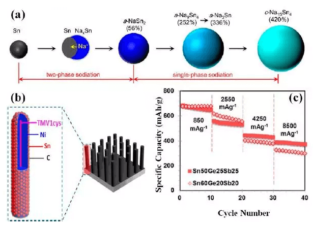 合金負極也是一種十分具有吸引力的負極材料,例如錫基和硅基材料,由于其較高的比容量,成功吸引了人們的注意。當然與鋰離子電池一樣,這些材料仍然存在膨脹過大的問題。錫基負極能與Na形成Na15Sn4合金,比容量可達847mAh/g,但是這也伴隨著420%的體積膨脹,這極大的制約了錫基負極的應用。
