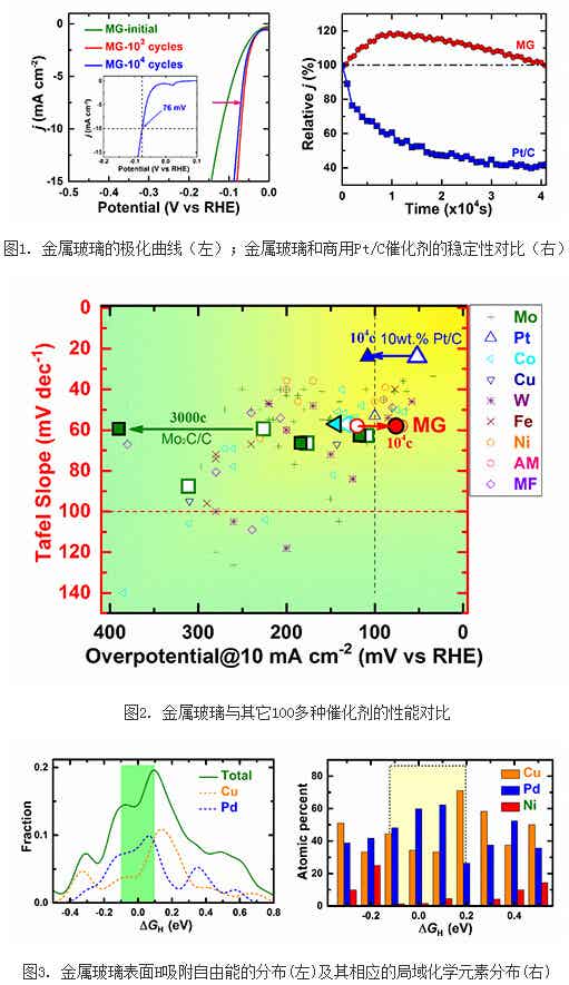 中國科學院物理研究所研究員汪衛華研究組與中國科學院北京納米能源與系統研究所研究員孫春文課題組及北京計算科學研究中心青年千人計劃研究員管鵬飛課題組合作,研究發現Pd基非晶態合金(又稱金屬玻璃Metallic Glass, MG)作為電化學分解水的催化劑,不僅表現出優異的催化活性,并且具備獨特的自穩定性。