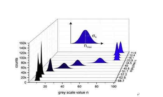 接下來,本文關注了向涂層噴射空氣流時所捕獲第二張照片的差異。圖5a是在兩個干燥時刻,各自連續拍攝的三張照片的比較。捕捉第二張照片時,用加壓空氣噴嘴向照相區域涂層上直接噴射空氣氣流。干燥時間12.4s時,空氣吹掃涂層熒光變化不明顯,而40s時空氣吹掃涂層后,熒光明顯減少。圖5b是六張照片的高斯分布圖,在較短干燥時間(texit=12.4s)時,三張照片中獲得的nmax都很大,差值Δn12和Δn23小并且都落在實驗值偏差范圍內。而texit=40.0s時,三個nmax都很小,噴嘴作用導致的差值Δn12和Δn23很大。在干燥的后期階段,涂層表面液相消失,孔隙內的液相排除成為主要干燥過程,液相分布與孔結構分布相關,與初始液相狀態不一樣。