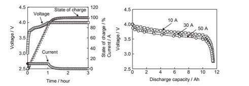LVP10電池在25℃的環境溫度中以10A的恒電流充電至4.0V,接著繼續進行合計3小時,以恒電壓充時時的充電特性示于圖3。本電池進行1小時的充電可從完全放電狀態充電至80%以上的充電深度(SOC)。在飛機起飛時電池SOC為較高的狀態。所以只有優異的充電接受性