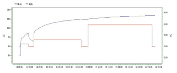 對比化成曲線不難發現極卷干燥的電池有很明顯的水分分解平臺,造成這種結果的原因是極卷在轉運過程和化成前的工序吸水過多造成的,致使電池整體水分含量超高,正常電池開始化成后,電壓是直線上升的趨勢,極卷實驗電池開始化成電壓上升一段就停止這說明電池可能在形成SEI 膜時有較多的副反應參與,所以這個階段電壓沒有上升的原因可能是在持續形成SEI 膜,導致產氣量上升。因此對于極卷干燥來講,必須嚴格控制車間環境的水分。通過整個化成時間來看,極卷干燥生產的電池極化較大。