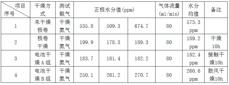 對電芯的干燥采用接觸式和非接觸干燥方式(即真空熱傳導和真空熱輻射的方式),通過卡爾費休-庫倫水分測試檢測結果如下: