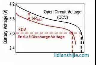 用數據說話,下圖表示一電池放電曲線,X軸表示放電量,Y軸表示電池開路電壓,電池理想放電狀態為黑色曲線,紅色曲線是考慮到電池內阻時的真實狀態。